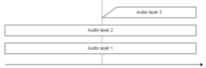 Vertical change. Audio layer 3 is added on top of the already playing layers. - Vertical change. This concept is also called vertical re-orchestration or layering (among a multitude of other terms). Vertical change refers to audio layers (singular instruments or multiple instruments bundled together) being added, removed, or replaced. To give you an example: The main character is presented with three choices regarding which of their friends they would like to hang out with. Each of the characters has their own main instrument that they are associated with. The first character's instrument is for example a piano, the second character's is an acoustic guitar, while the third one's is a trumpet. The general melody-less hang-out music is playing in the background while the player is mulling over the choice. Once they have chosen a character, a melody is added on top of the already playing background music. The melody is played by a different instrument depending on which character they have chosen. This gives each of the character's hang-out sessions a personal flavor while still signaling that this is a general hang-out session. Another example would be a scene where the characters are about to get into a fight. Tense music starts playing while they are throwing insults at each other. Then someone throws the first punch and drums set in alongside the already playing tense music, adding even more intensity to this scene. Music layers are oftentimes synced to each other. One technique that's usually used in this context is starting all audio layers at the same time but setting the volume of layers that aren't needed to zero. Their volume is then increased once they are needed. Alternatively, one could sync the new layer to the timestamp of the currently playing layer. But they don't necessarily always need to be synced. Ambient music or ambient sounds could be examples where this is not necessary. A strong wind sound setting in over the currently playing bird chirps doesn't need to be synced to the bird chirps. Ambient music layers without any continuous rhythmic components also usually don't need to be synced.