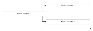 Horizontal change. Audio snippet 1 could potentially jump to snippets 2 and 3. - Horizontal change. Also called horizontal resequencing. The distinction between audio replacement and manipulation is not clear when it comes to horizontal change. Horizontal change generally encompasses audio replacement. If an audio track transitions to another section within the same audio track or an alternative version of the same composition, however, then it could be defined as audio manipulation making use of the horizontal change technique. For the sake of this guide, the following explanation will focus on the transition from one version of a composition to another version of the same composition. A hypothetical scenario could be: The main character is presented with the choice of which attraction they would like to visit at a town fair, a haunted house or a café. Depending on which choice is picked, the music seamlessly transitions into another variation of the track. In practice, this oftentimes means that the transition happens on the beat and the new variation of the track starts where the last one ended. If the original track ended at the end of bar 8, then the new track starts playing at the beginning of bar 9.