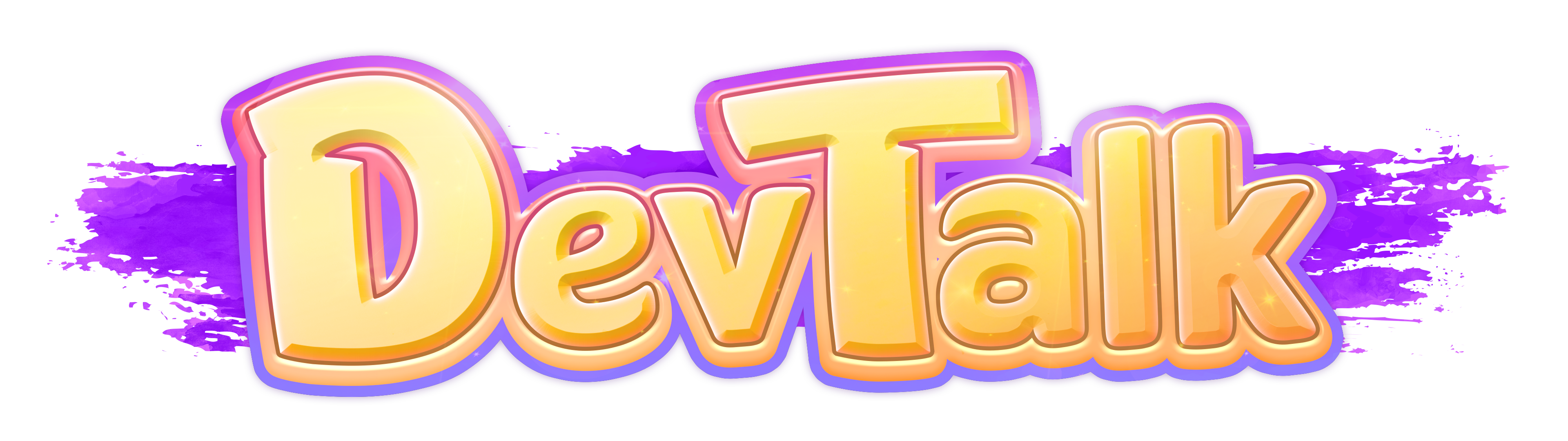 DevTalk logo. Reads "DevTalk" in yellow-orange bubble text over purple paintbrush strokes.