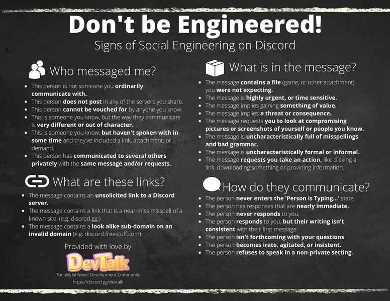 Infographic with metal grey background and white text. The DevTalk logo is in the bottom left. Title: Don't Be Engineered! Subtitle: Signs of Social Engineering on Discord
