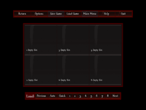 This menu allows users to save, load, and possibly delete their save data. Saves act as bookmarks that the player can use to quickly access some parts of the story.