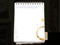 Jisei's text box employs a quick menu and a CTC indicator. Instead of a character portrait, there is a notepad which fills with writing as the game progresses, allowing players to keep track of important details about the mystery they need to solve.