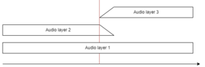 There are several ways to implement this type of audio, as there are many ways in which you can transition from one audio track to another, from an audio track to complete silence or from complete silence to an audio track. Visual representations of the different techniques are added under each section. Marked in red are the trigger points, meaning the moments the game has received the command to change the audio.