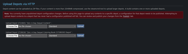 You can now use the upload page on the main game to upload your ZIP file containing your DLC. Remember to target the correct Depot for the DLC. You can immediately set the depot as live for the default branch.