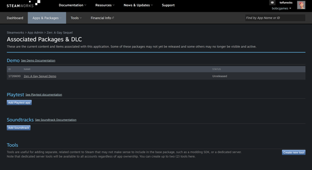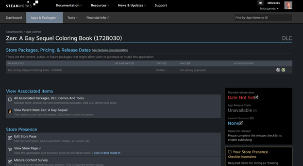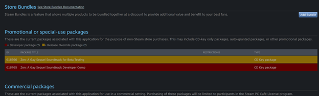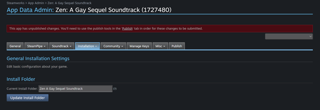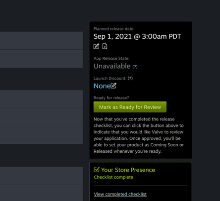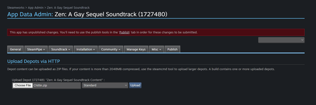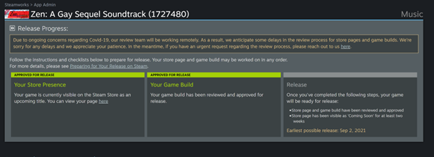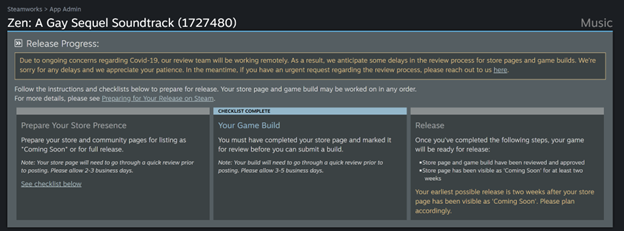 You can then submit the store pages and build for review by Steam in the usual manners from the dashboard. (For a soundtrack, you can't submit the "build" for review until the store page has been submitted for review.)