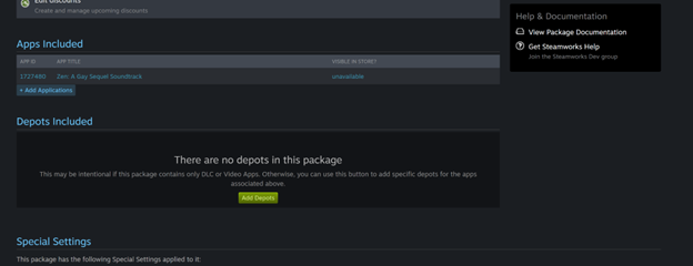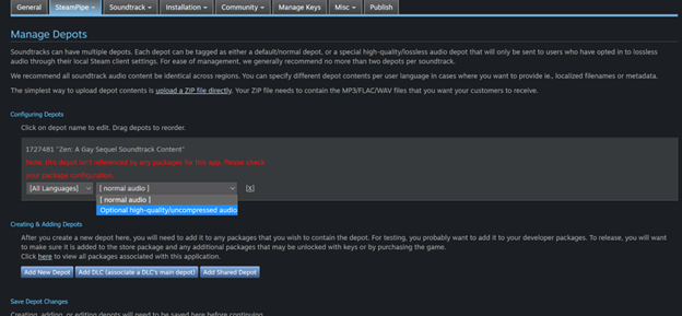 You'll also need to add the depot to all packages for the soundtrack, which you can access from dashboard > View Associated Items > All Associated Packages, DLC, Demos and Tools. Add it to the beta testing and developer comp packages.