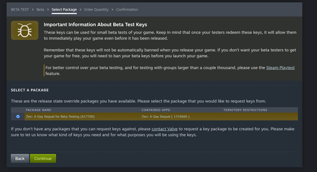 You can generate special beta keys to allow others to help test the game before it is fully released. (This is also the only way to test Demos.) Navigate to Technical Tools > Request Steam Product Keys > Release State Override, and select Beta Test.