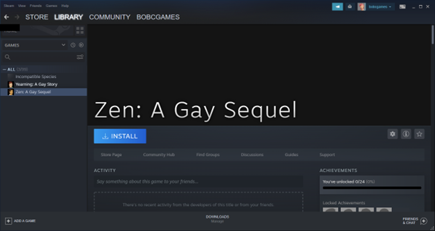 After you have uploaded and published a game build on the default branch, the game should show up in the Library of the Steam account used for the above configurations. You can install the game and run it to test out functionality, including achievements. You can do this even if your store page isn’t yet live. (Remember that you can not test demos this way.)