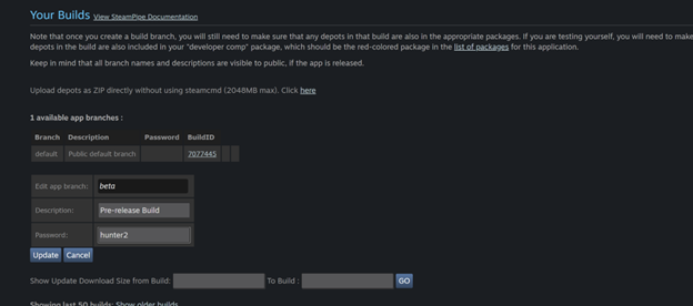Once the branch is created, you can set different builds live on different branches. The "default" branch is your public release branch, but when you upload a new build (see Upload Your Game to Steam), you can set it live on the beta branch instead of default. You can also manage your builds (and which ones are live) from the same page.